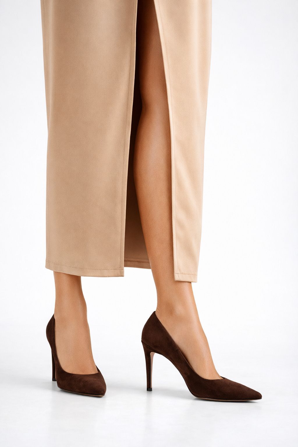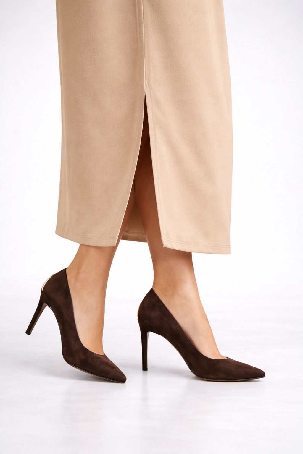 Yüksek topuk feminen bir siluet yarartırken ,süetin asil dokusu görünüme lüks bir dokunuş katar .