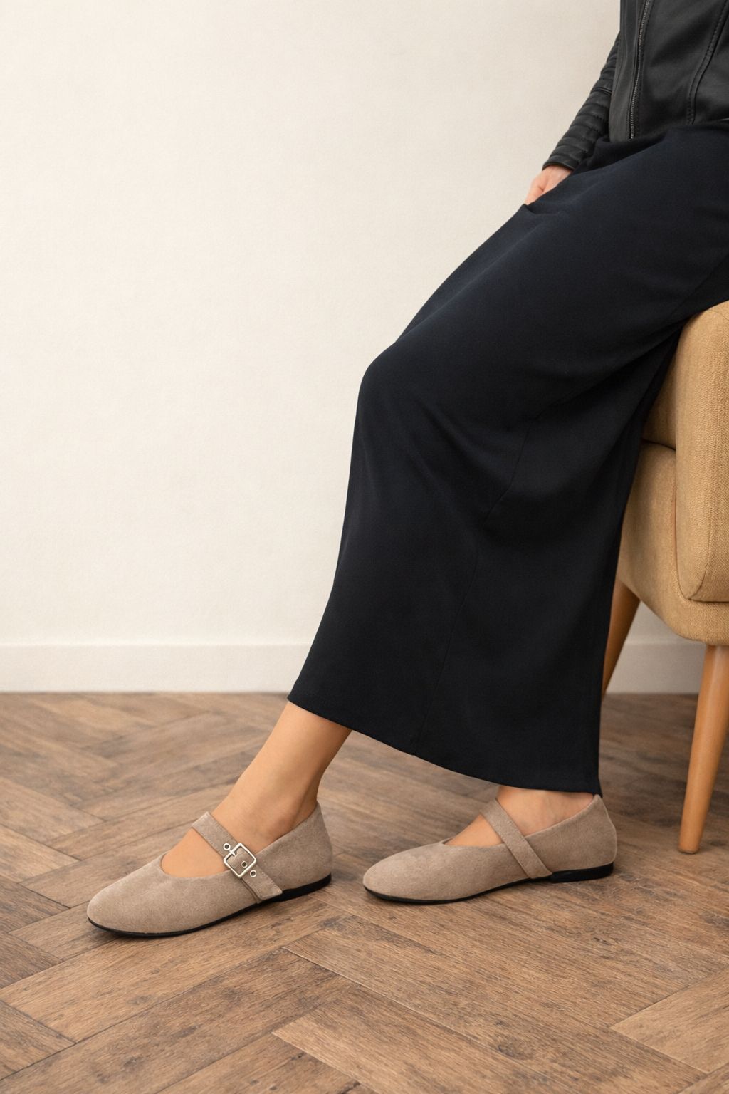 Doğal süet dokusu ve altın tokalı Mary Jane tasarımıyla her adımda şıklık.